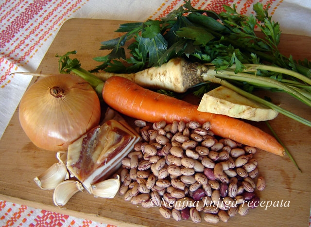 Nasjeckajte luk, stavite ga pirjati na ulje, kad postane staklast dodajte crvenu papriku, promiješajte i dodajte grah. Zalijte s vodom tako da bude pokriveno. Mrkvu, korijen peršina i celera isjeckajte na kockice i zajedno s nasjeckanom lišćem peršina i celera dodajte grahu. Posolite i popaprite. Neka sve zajedno kuha pola sata.