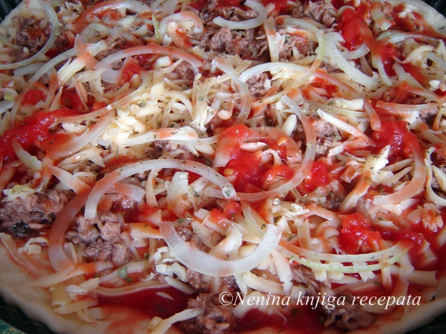 U međuvremenu naribajte sir, ocijedite komade tune od ulja, luk narežite na što tanje kolutove, u pasatu dodajte vodu i malo origana. Na tijesto izlijte pola količine pasate, razmažite po cijeloj površini, posipajte s 3 količine sira, rasporedite komade tune, dodajte ostatak sira te na vrh poslažite kolutove luka. Zalijte s preostalom pasotom i po želji posipajte s još malo origana.