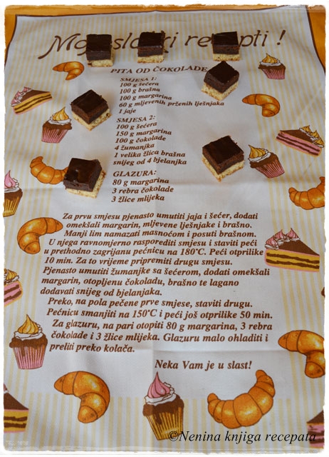 Jeste li kada napravili recept koji je otisnut na kuhinjskoj krpi? Meni je ovo prvi mada imam nekoliko krpa s receptima. Neke su naslijeđene, neke dobivene na poklon, a neke sam i sama kupila, jer su mi bile simpatične…Ova je stara oko godinu dana i kupljena je zato što je narančasta, a ne zbog recepta. Naime originalni recept obiluje margarinom, a u našoj obitelji margarin se nikada nije koristio za kreme, glazure, vučena, dizana i prhka tijesta. Mama je ponekad u neke biskvitne mješavine znala staviti margarin i to je bila sva upotreba. Takve navike su ostale i kod mene s tim što sam unazad otprilike dvije – tri godine prestala koristiti margarin u potpunosti. Prije nekih mjesec dana tražeći recept za čokoladnu tortu naišla sam na recept koji je pokupio puno pozitivnih komentara na stranicama Coolinarike. Recept mi se učinio poznat i tek nakon nekog vremena mi je kliknulo da je to recept s kuhinjske krpe…odlučila sam ga napraviti – s putrom